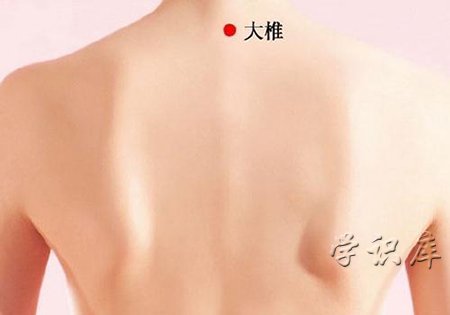 穴位:位于第7颈椎棘突下凹陷中。取穴时正坐低头,该穴位于人体的颈部下端,第七颈椎棘突下凹陷处。