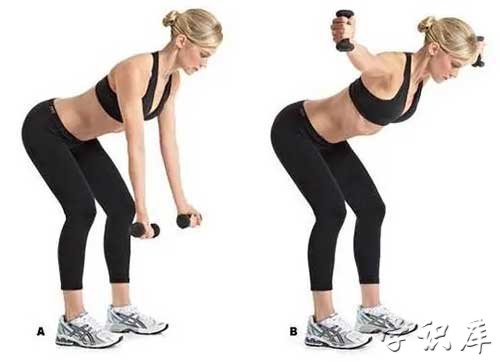 上身挺直前压,保持俯身屈膝姿势,双手各持哑铃放在膝盖前方,将手臂两侧伸展,让手臂与肩部平行,再将双臂恢复到原始位置,每次训练做两组,每组10次动作。
