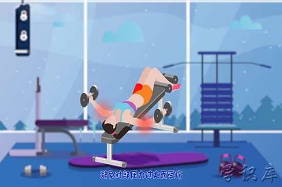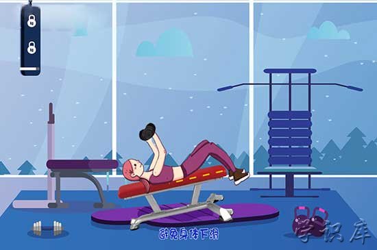 下斜杠铃推胸需要躺在训练椅上,让膝盖高于头部,双脚固定住在椅子上,避免身体下滑,双手持哑铃放于胸前,再将哑铃反复向上垂直推起放下。