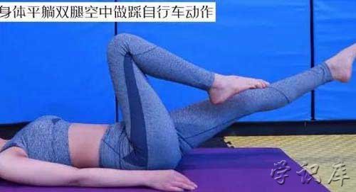 身体先平躺,双腿抬起轮流踩踏,脚一定要伸直,脚背要下压,腹部发力踩够25下为1组,可以踩2组。