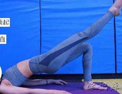 依然是平躺身体,一边腿屈曲然后另一条腿向上伸直,每次上升尽量撑到至少5秒。两边腿轮流伸直上顶,一边25下为1组,每次做2组。用臀部和腹部的力量把身体向上顶,伸直的腿千万不要掉下来,屁 股在下来的时候也不要碰到地面,