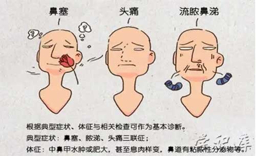 1、典型症状:鼻炎症状主要有鼻塞、流涕、打喷嚏、鼻痒、嗅觉下降、头痛、头昏,慢性鼻窦炎多表现为头沉重感。