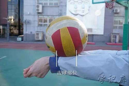 排球击球部位就是两小臂挠骨内侧构成平面击球,一般应该距离腹前大概一手臂的距离,初学者学习排球时,可以选择准备姿势,上体稍微向前倾两脚张开,保持与肩同宽的距离,然后手臂微屈置于自己的腹部前方,两肘稍内收。