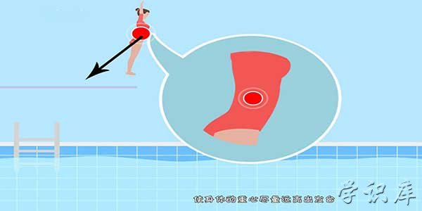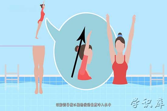 双手手臂伸直压住头,尽力低头使下巴贴近前胸,蹬离出发台时,运动员应该伸直身体,使身体的重心尽量远离出发台,在空中尽量强调身体的流线型,让自己的身体如同标枪一般冲入水中。