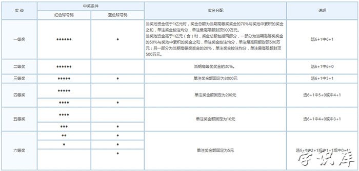 六等奖:1个蓝色球号码相符(有无红色球号码相符均可)。