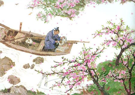 东晋太元(公元376-396)年间,武陵有个人以捕鱼为生。有一天他沿着溪水划船而行,忘记了路有多远。忽然遇到一片桃花林,在小溪两岸的几百步之内,中间没有其它树木,花草鲜嫩美丽,地上的落花繁多交杂,渔人对此感到非常诧异。他继续向前行船,想要走到林子的尽头。