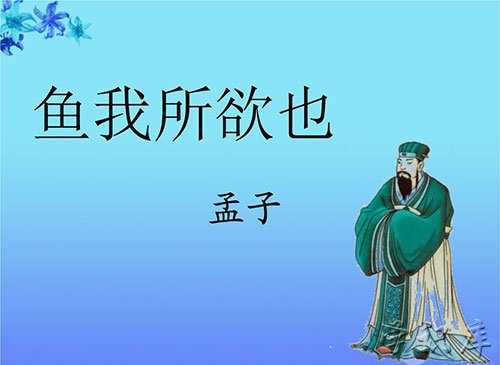 鱼是我所想要的,熊掌也是我所想要的,如果这两种东西不能同时得到,那么我就只好放弃鱼而选取熊掌了。生命是我所想要的,道义也是我所想要的,如果这两样东西不能同时都具有的话,那么我就只好牺牲生命而选取道义了。生命是我所想要的,但我所想要的还有比生命更重要的东西,所以我不做苟且偷生的事。死亡是我所厌恶的,但我所厌恶的还有超过死亡的事,因此有灾祸我也不躲避。如果人们所想要的东西没有能比生命更重要的,那么凡是能够用来求得生存的手段,哪一样不可以采用呢?如果人们所厌恶的事情没有超过死亡的,那么凡是可以躲避祸患的办法为什么不可以做呢?采用某种手段就能够活命,可是有的人却不肯采用;采用某种办法就能够躲避灾祸,可是有的人也不肯采用。由此可见,他们所想要的有比生命更宝贵的东西(那就是“义”);他们所厌恶的,有比死亡更严重的事(那就是“不义”)。不仅贤人有这种心,人人都有,只不过贤能的人不丧失罢了。