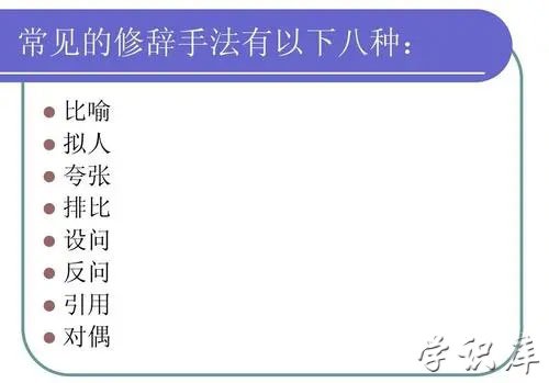 文章中运用修辞方法是为提高表达效果,使语言表达鲜明、生动。我们常见的修辞方法有:比喻、拟人、夸张、排比、对偶、借代、反问、设问等。但是大部分的小朋友区分不了,因此,我认为很有必要详细讲解一下:
