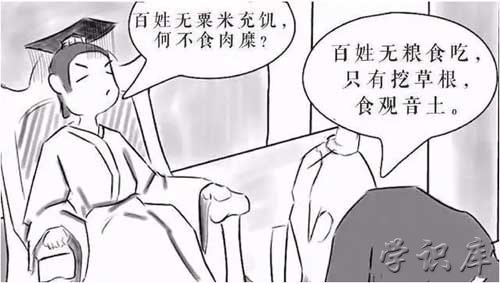 出自《晋书·惠帝纪》:帝尝在华林园,闻虾蟆声,谓左右曰:“此鸣者为官乎,私乎?”或对曰:“在官地为官,在私地为私。”及天下荒乱,百姓饿死,帝曰:“何不食肉糜?”其蒙蔽皆此类也。