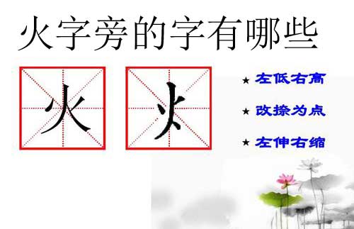 1、火、灰、炒、烟、灯、炮、灿、燎、炸、焰、烂、燃、灭、炖、烧、炫、烙、炉、烘、炎、烤、烁、炯、煌、煤、灶、焕、燥、炕、灸、烛、炼、烦、熄、烫、熨、炊、煜、焐、熳;