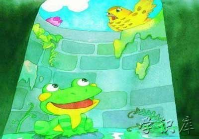 青蛙坐在井里,小鸟飞来了,落在井沿上。青蛙问小鸟:“你从哪儿来呀?”小鸟回答说:“我从天上来,飞了一百多里,口渴了,下来找点儿水喝。”青蛙说:“朋友,别说大话了!天不过井口那么大,还用飞那么远吗?”