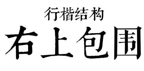 这一类的字涉及的部首“勹”,书写此类字的时候,要注意右上包围的横折的折笔书写成垂直或倾斜两类,横折的折角不要写成过圆的,包围部分要上方横向书写稍短些,被包围部分要向左下略微拉伸露出来一部分,以保持汉字的平衡,例如“司”字,右上角的包围部分垂直书写,被包围的“口”字应略向左侧移动,比上方的横要向左边突出些,例如“句”字,里面的口要参考横折钩的位置,向左侧移动。