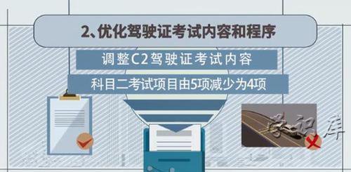 一是优化驾驶证考试内容和程序。小型自动挡汽车科目二考试取消坡道定点停车和起步项目,考试由5项减少为4项,更加贴近实际驾车操作要求,减轻考生考试负担。小型自动挡汽车考试科目三约考间隔时间,由科目一考试合格后30日调整为20日;对增驾大中型客货车驾驶证的,科目三约考间隔时间由40日调整为30日,减少群众待考时间。对申请小型汽车异地分科目考试的,申请变更考试地的次数由1次调整为不超过3次。据估算,新措施实施后,每年将惠及新考领驾驶证人员2000多万。