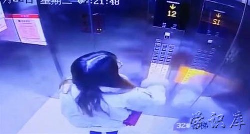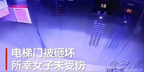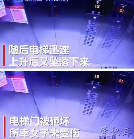 女子迅速按下数排楼层按钮,在电梯停在12楼时立即离开。随后电梯迅速上升后又坠落下来,电梯门被砸坏,所幸女子未受伤。