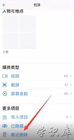2、然后在相册界面找到“最近删除”一项并点击进入,看看此相册文件夹中是否有误删的图片或视频。