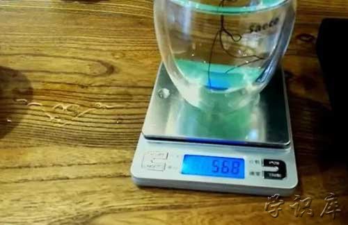 三、慢慢的再将细线提起,让翡翠离开水底但不要露出水面,记录台称的度数为21.5g。