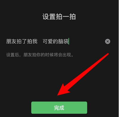 3、然后在“朋友拍了拍我的”后面输入自己想要的文字,然后点击“完成”。在拍一拍后面输入你想出现的文字,比如:我可爱的脑袋、修长的双腿、八块大腹肌、小蛮腰、水蛇腰等可爱的文字后缀即可,当对方拍你的时候就会自动出现了。推荐阅读:拍一拍有趣后缀文字