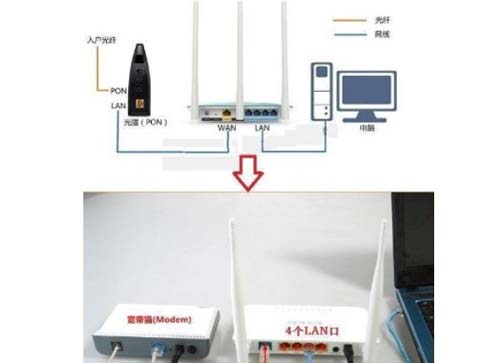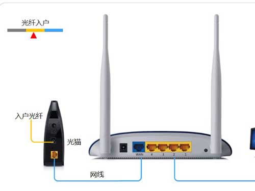 路由器安装方面很简单,只要记住WAN口是必须用来连接猫的网线或外部网线的,而LAN口则是用来连接电脑的,如果是无线上网,则LAN口无需连接。以下是光猫,路由器,笔记本与路由器安装连接示意图: