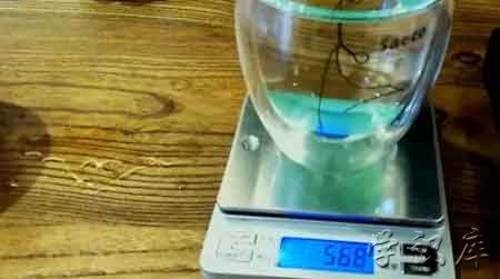 2、我们现将第一块翡翠慢慢的放入水杯中,等翡翠沉入杯底后放开绳子,这时记录下台称的度数,为56.8g。