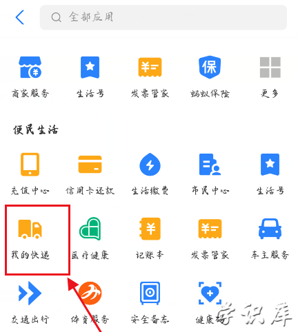 1.打开支付宝,点击【更多】,在更多功能的【便民生活】下点击【我的快递】;