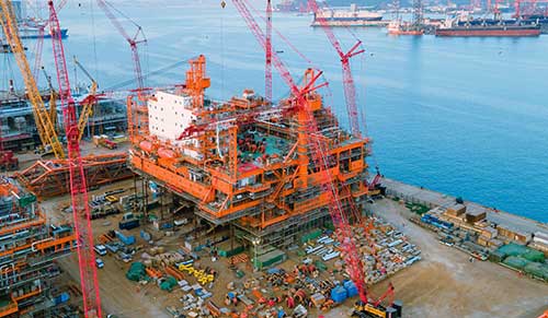 中国海油天津分公司工程建设中心项目负责人 陈涛:中心平台设计油气年处理能力超500万吨,平台在陆地完成拖拉装船、固定、检验后,将于7月运往海上开展安装、连接、调试工作,预计年底投入试生产。