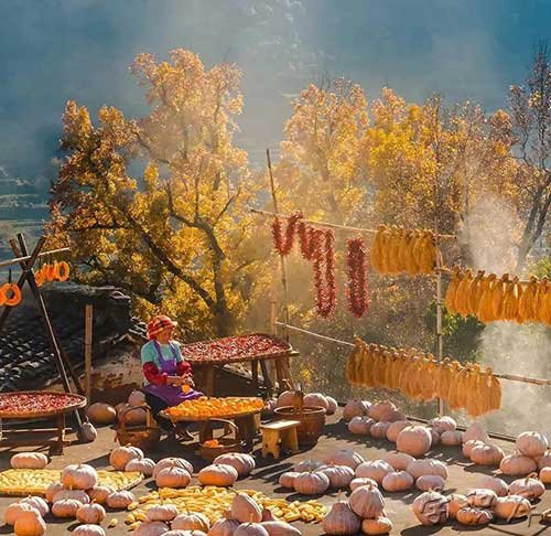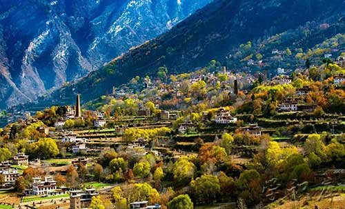 每到秋天,这里漫山彩林绚丽,隐世独立的山谷藏寨,掩映在金黄交错的彩林中,傍晚山谷中袅袅炊烟升起,牛羊休闲吃草,四周雪山巍峨耸立,如世外桃源一般。