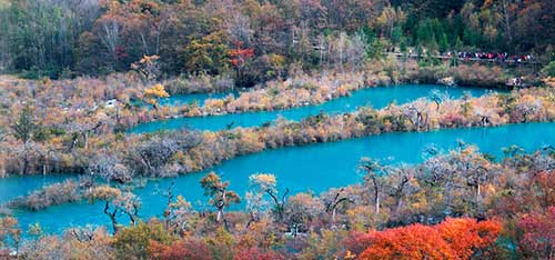 九寨沟的美景四季不断、各有不同,尤以秋季的五颜六色最为好看,而秋季中又以每年10月15日至30日为最佳时期,此时大部分树叶都已经完全变色,有的是金灿灿的黄,有的是漫山遍野的红,再加上其它的颜色作为过渡和点缀,九寨沟俨然成了一个上帝的调色盘。