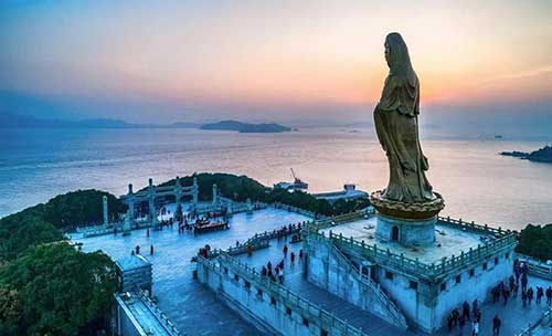 1、南海观音:坐落于浙江双峰山南端的观音跳山岗上。此处势随峰起,秀林葱郁,气顺脉畅,碧波荡漾。莲花洋彼岸的朱家尖,隔海侍卫;双峰山坡麓的紫竹林,潮音频传。身临其境,如临极乐国土,尘念顿消。佛像顶现弥陀,左手托,右手施无畏印,妙状、慈祥,体现了观音菩萨“慧眼视众生,弘誓深如海之法身。”佛像采用新型仿金铜精铸。