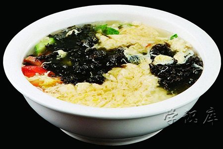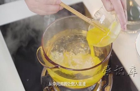2、锅中加入适量水烧开后转小火,倒入蛋液,放入洗好的紫菜;