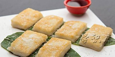 7.锅烧水加适量食用油,油温7成热放入糍粑,煎至一面金黄的时候翻面接着煎,煎至两面金黄盛出放入盘里,再浇上熬好的糖浆,美味即成。