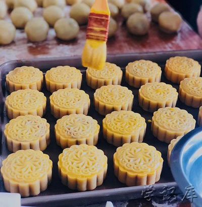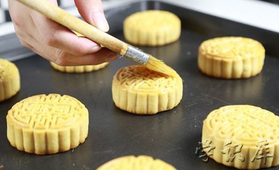 8、烤箱预热至350F。在月饼表面轻轻喷一层水,放入烤箱最上层烤五分钟。取出刷蛋黄液,同时把烤箱调低至300F。再把月饼放入烤箱烤七分钟,取出再刷一次蛋黄液,再烤五分钟,或到自己喜欢的颜色为止。
