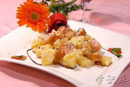 (6)上油锅煎炸,小火炸到虾变金黄,捞出沥油;菠萝与青红辣椒放在盘子里,浇上沙拉酱。