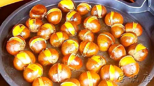 2、当栗子皮在热胀冷缩的作用下,用手轻轻一剥就可以打开,最后再一颗一颗剥开就可以啦,很简单吧!