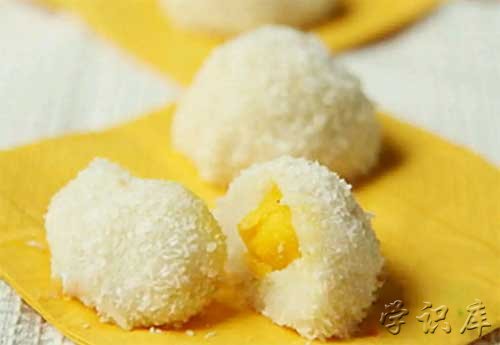 3、将其拿出,和面,用保鲜膜裹好,静置冷却。将面团包上豆沙,糯米滋就完成。