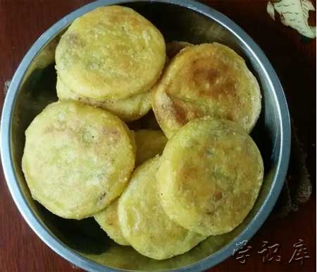 2、压好的糯米饼下油锅煎,煎糯米饼的同时调鸡蛋,加糖。