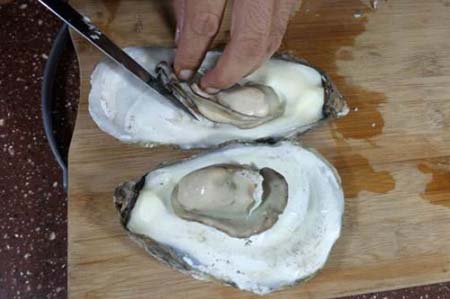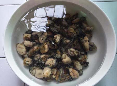 打开生蚝壳后,用刀慢慢分离开蚝肉,撬开生蚝就可以找到生蚝的内脏,将生蚝浸泡在面粉水里去除粘性,然后用清水反复冲洗生蚝的内脏,撕去上面黑色的部分(内脏),去除内脏里的杂质。