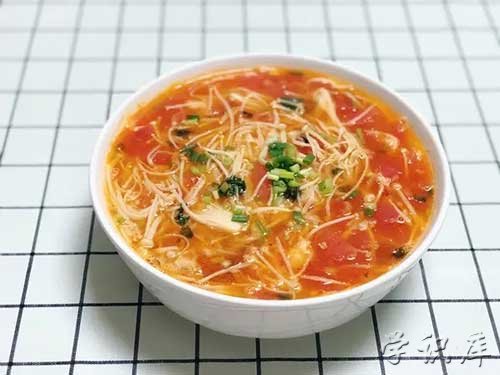 金针菇汤的做法是起锅烧油放入切好的姜片、蒜末炒出香味后,加入西红柿翻炒出汁,再加水、放入金针菇之后再煮15分钟。最后倒入蛋液划散煮熟,并撒上葱花,美味的西红柿金针菇蛋汤就完成了。