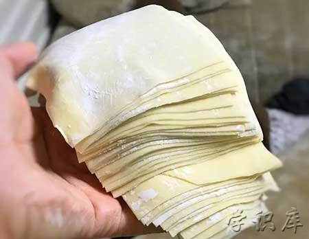 3、最后将擀好的面片切成大约半个手掌大小的面皮,馄饨皮就做好了