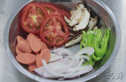 香菇几个,除去根茎切成条。青椒半个,切成青椒圈。西红柿一个切成薄片。洋葱半个切成丝。火腿肠切成片。