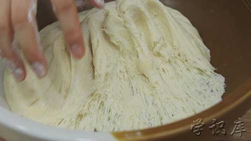 1、2个小时以后,面团发酵好了,扒开面团看一下,面团好多蜂窝眼,如果发酵的不太好,可以延长发酵时间。