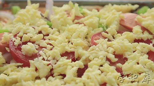 5、最后再撒上一层奶酪,放在烤箱里面,我们用的小烤箱,180度,30分钟就烤好了。