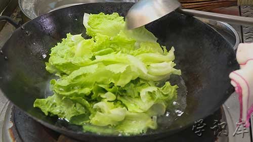 2、等水烧开后,下入生菜叶,用勺子翻动几下,使生菜受热均匀。