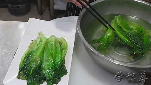 3、焯水10秒左右,即可捞出控水拔凉,生菜不宜焯水过久,否则会失去脆嫩的口感。然后把生菜叶沥干水分,摆入盘中备用。