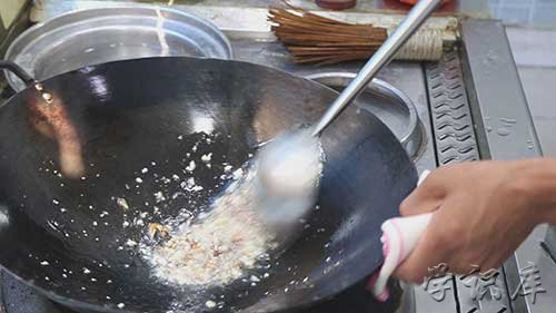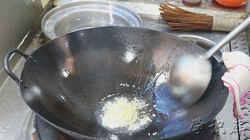 4、炒锅烧热添入半勺食用油,倒入蒜末翻炒几下,炒出蒜香味以后,加入蚝油10克,翻炒化开。