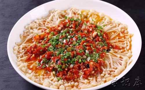 4、然后再撒上一些剁椒和葱花,锅中烧一些油,烧热后倒在金针菇上面就可以了。