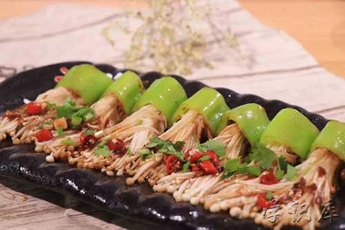 用料:金针菇适量、青椒4根、油适量、盐半勺、五香粉一茶勺、孜然粉一勺、辣椒粉一茶勺