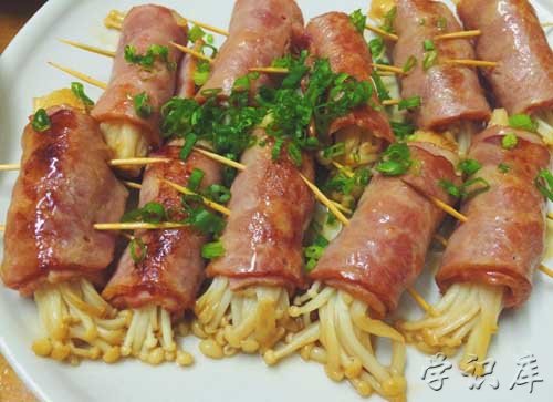 1、金针菇洗净去头,培根对半切成两段,用培根把金针菇卷起,用牙签固定。