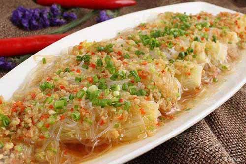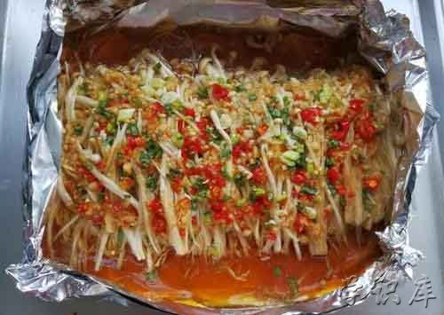 3、将食材取出摆盘,注意,不要把水拎太干,不然蒸出来会很干。放上小红辣椒,淋上一些麻油(随意)。因为蒜蓉酱汁会有些腻,小红辣椒可以让味道更鲜美。