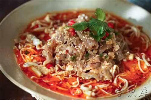 2、开一锅水,将肥牛放进去烫散后立马捞出用温水冲去浮沫控水备用。