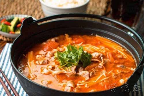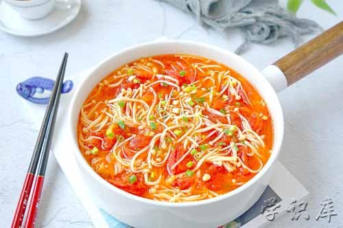 用料:肥牛150克、金针菇100克、西红柿3个、油菜(小)4颗、食盐3克、葱1段、姜2片、泡椒2个、橄榄油1/2汤匙、水650毫升
